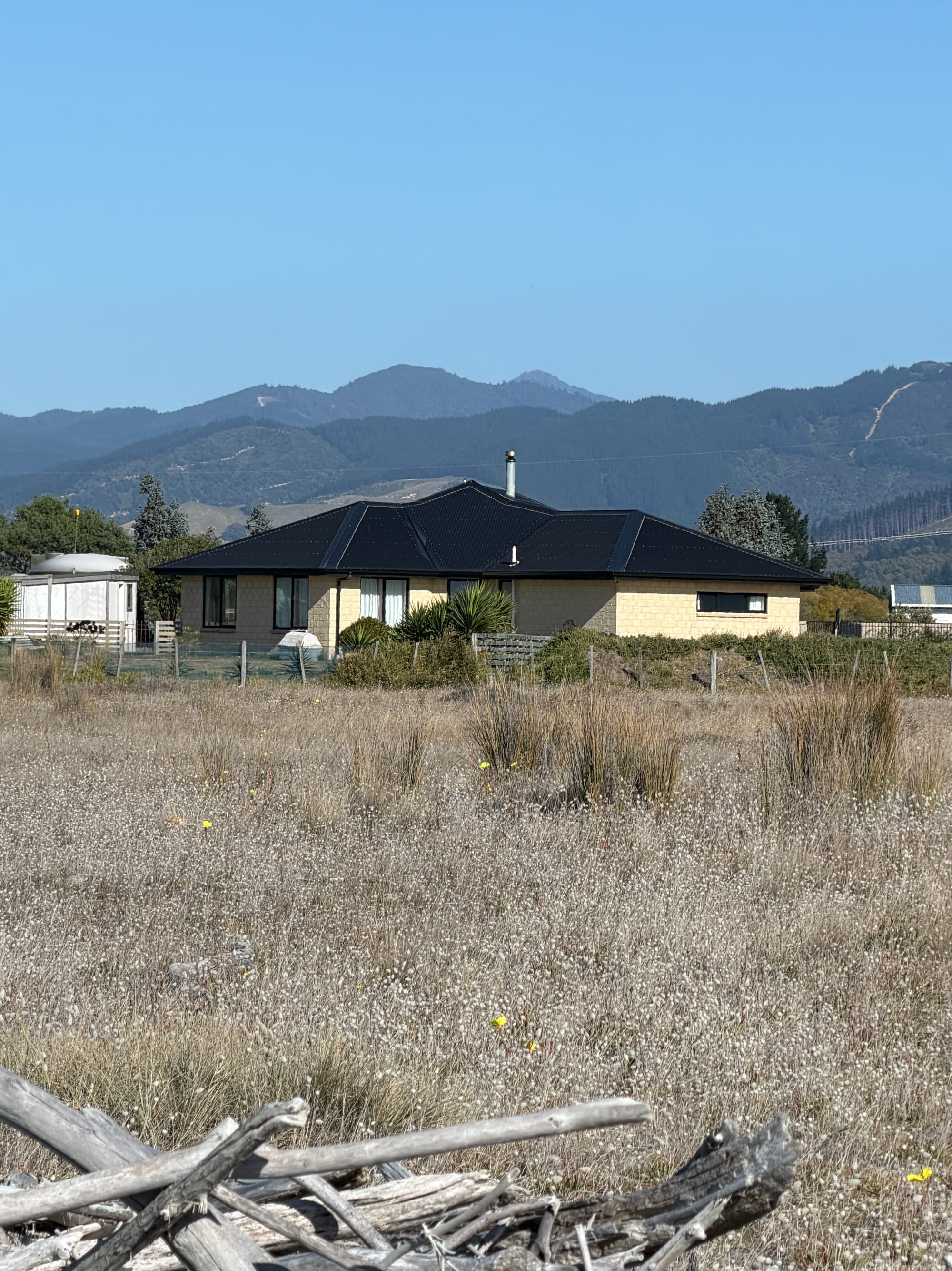House for sale on the beach in Rarangi on the left, what we could afford on the right!