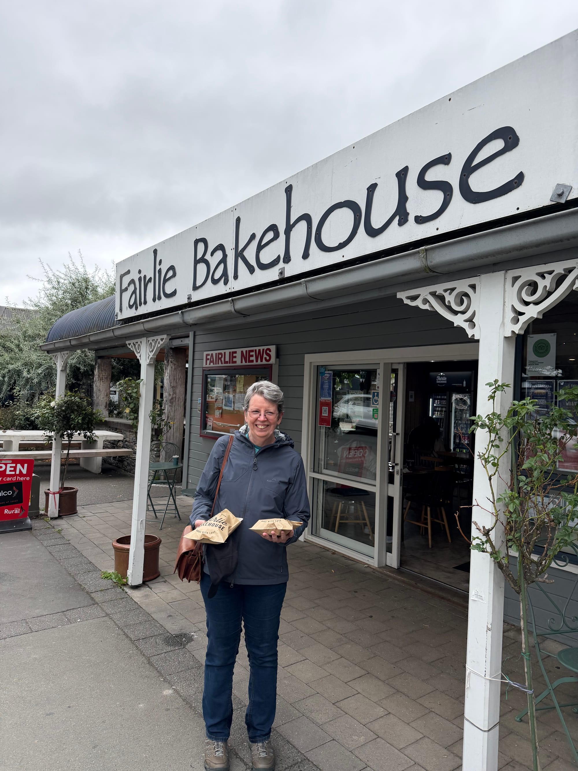 We got to Fairlie around 3:00 pm and checked into the Mackenzie Motel. Self check in, and another old style motel that had been refurbished. Nice private deck out back, comfortable bed, well equipped with fridge, microwave, and utensils. Love these places for a shorter stay. We made our way to the Fairlie Bakehouse to pick up a meat pie to share for dinner, and yes Sarah, it was yummy as was the custard square we shared for dessert!!! We stocked up on some fresh fruit from a local vendor who was having a slow day and had a wickedly dry sense of humour. Good fun for all of us.