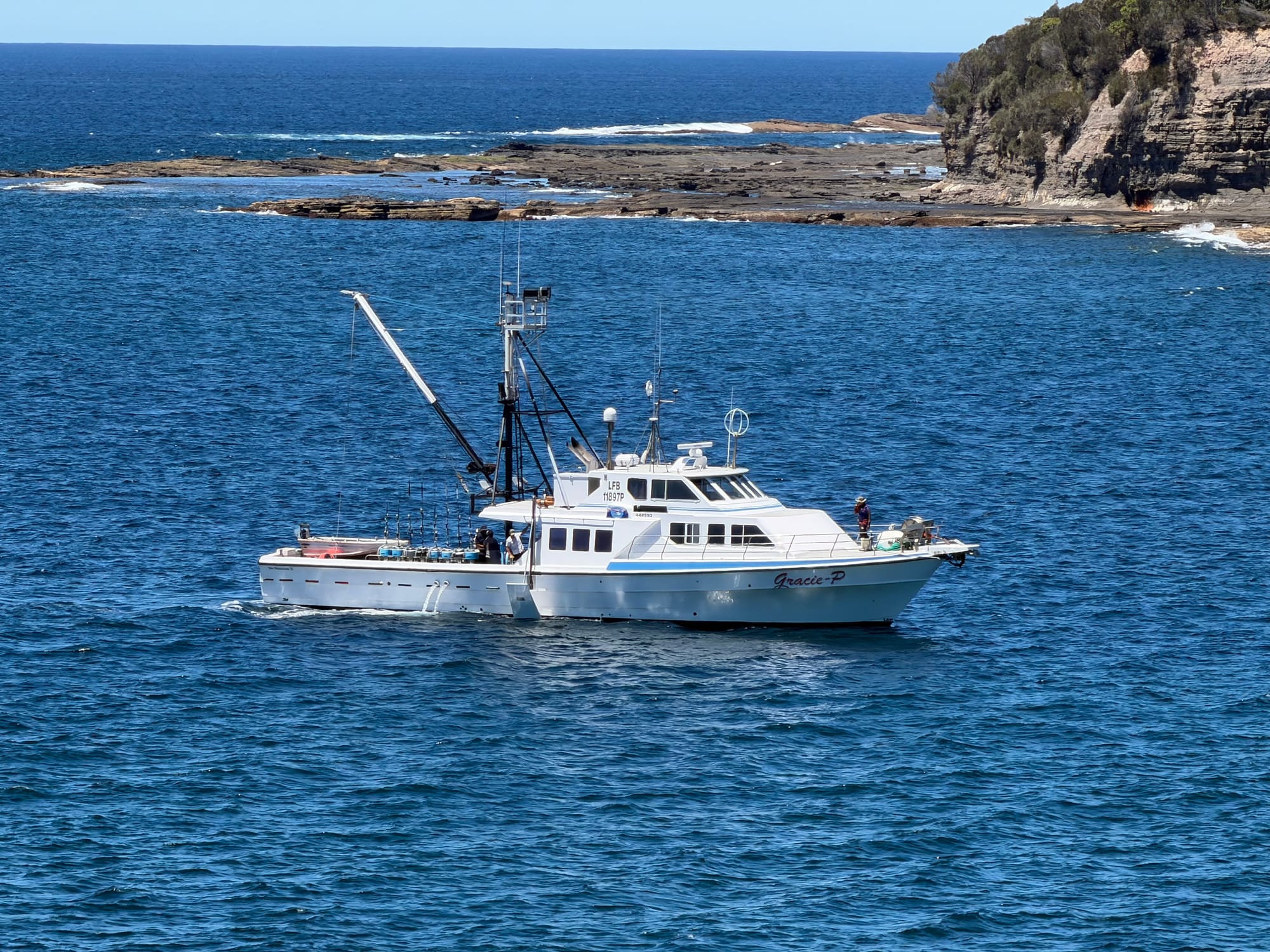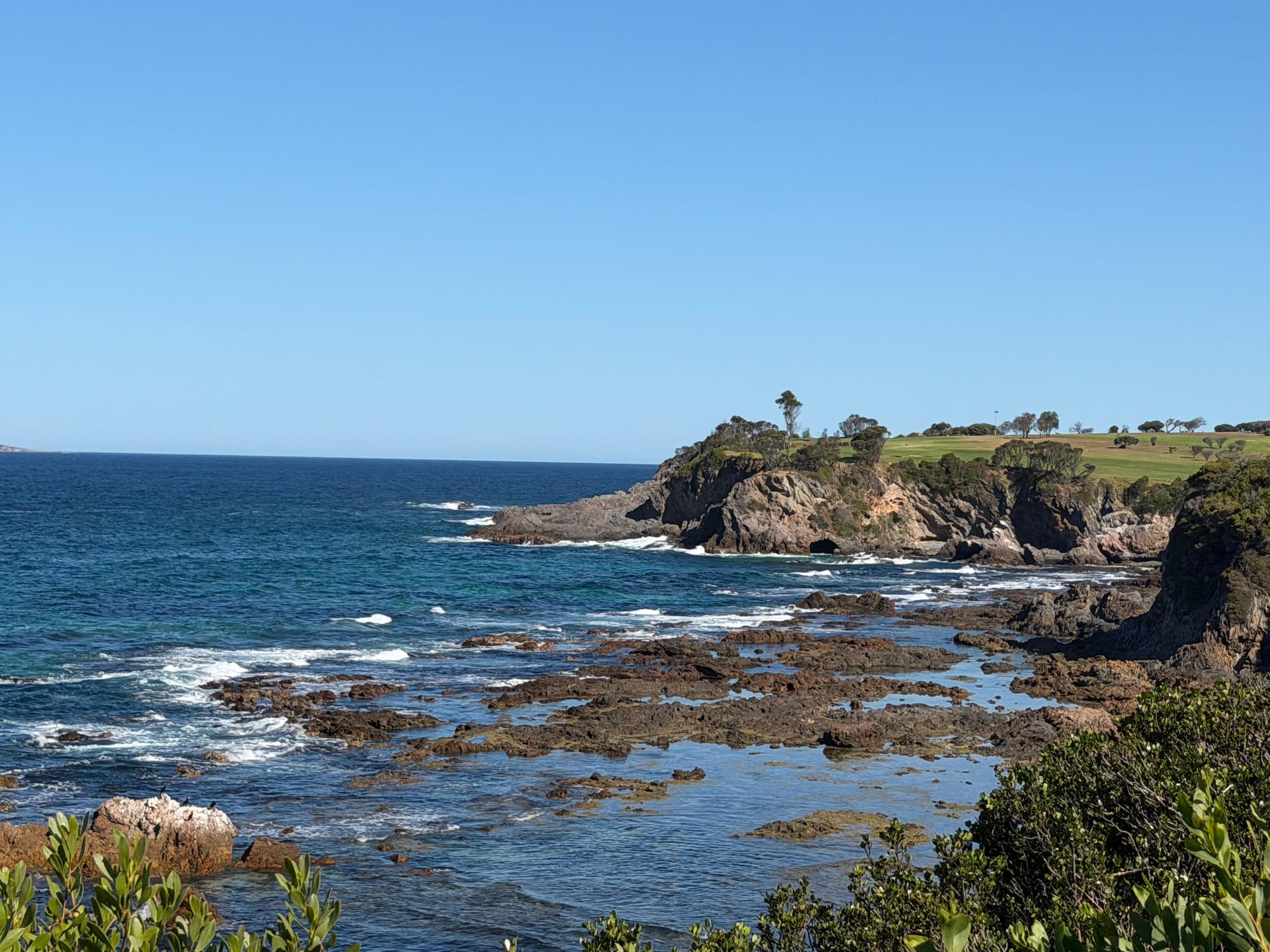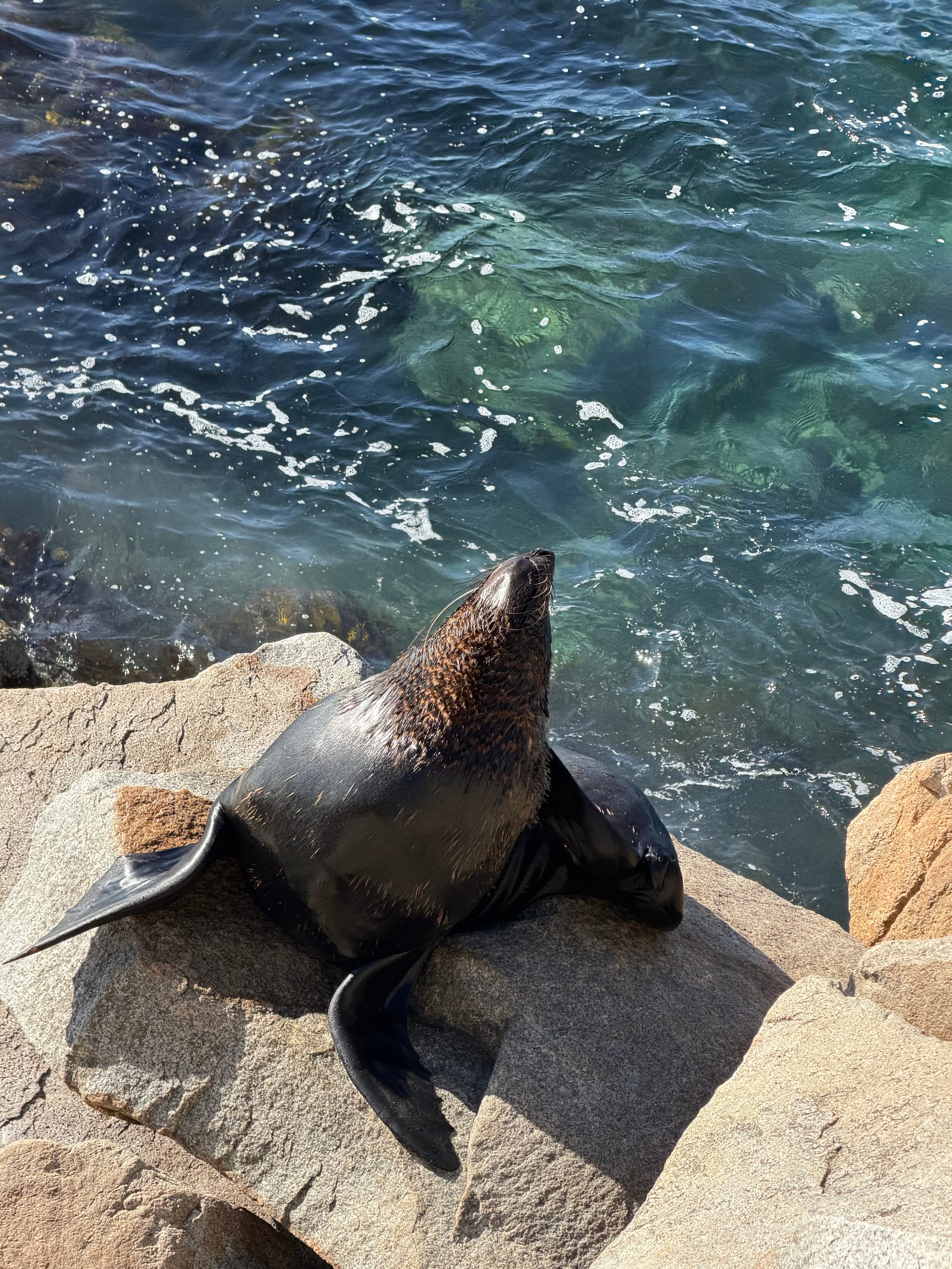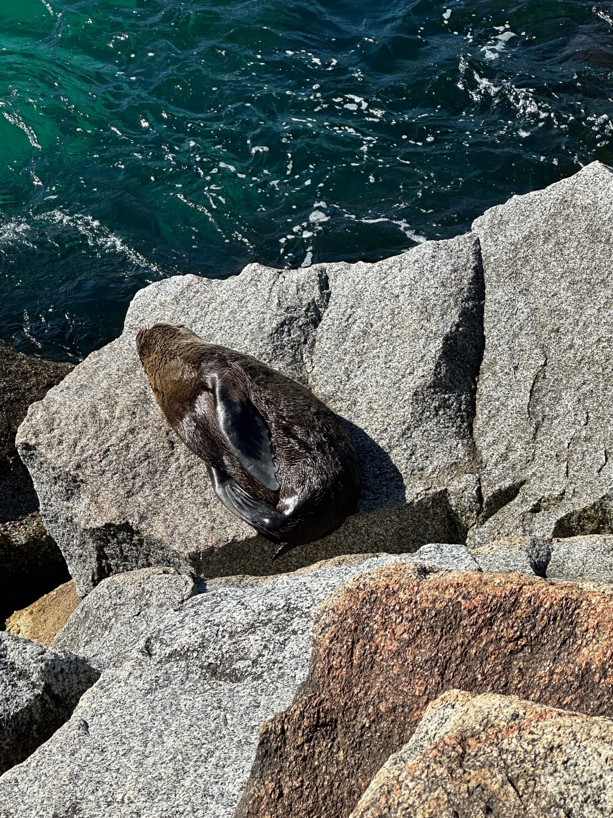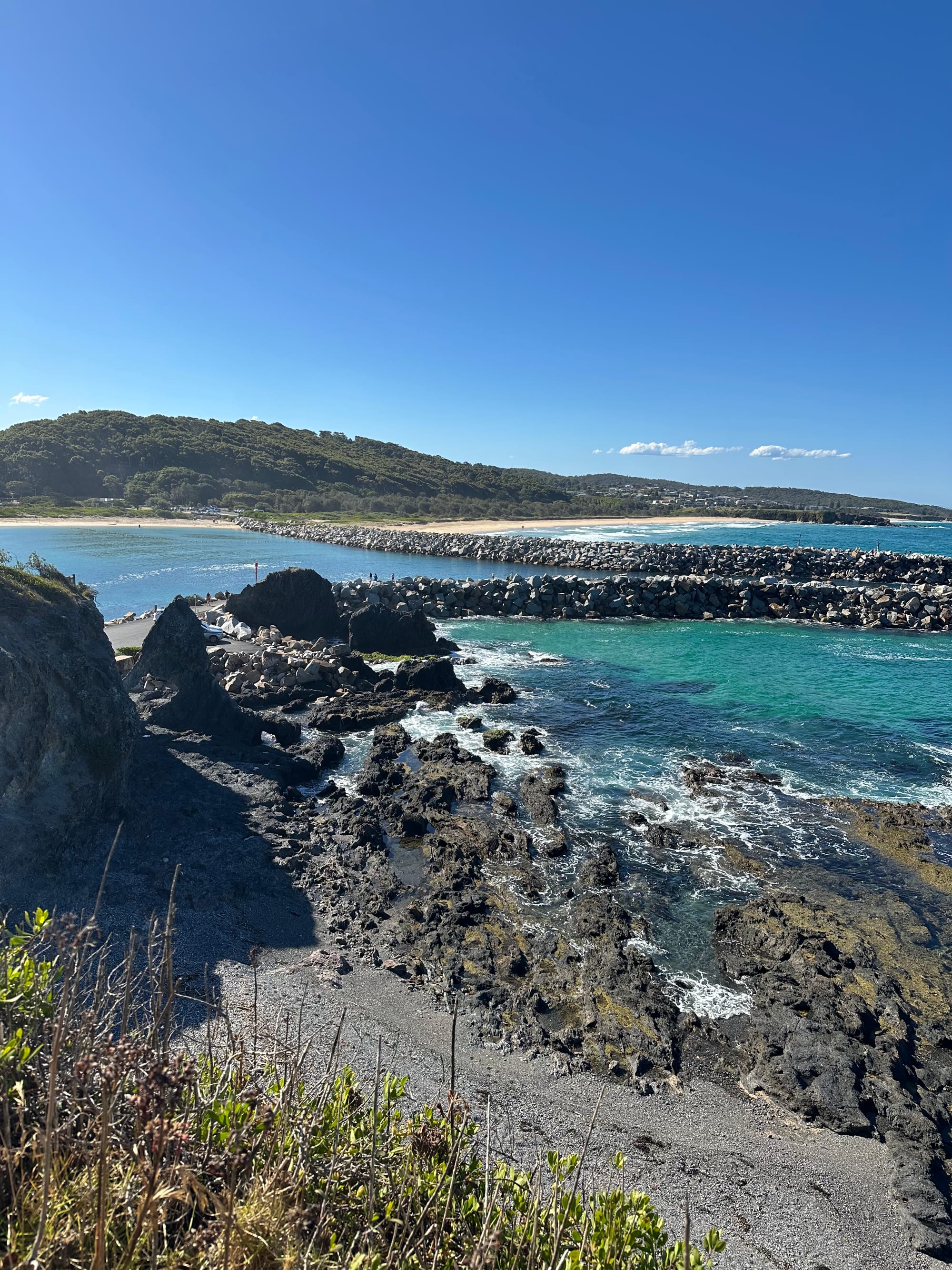Next stop for the day was lunch at the Starfish Deli in Batman’s Bay. Sat outside on the boardwalk watching the world go by. A bit pricey for lunch, but worth it. After picking up a few groceries, it was on to Narooma the last stop of the day before heading to our next holiday park. ChatGPT suggested a couple of worthwhile walks, one along a boardwalk in the harbour, then out to “Australia Rock” and the breakwater. Both were beautiful walks, and again, the views were breathtaking. When we walked out to the breakwater, built for the harbour entrance, the seals were taking advantage of the sun, lazing on the rocks, and feeding with the incoming tide. I’ll leave it you to figure out why its called Australia Rock….