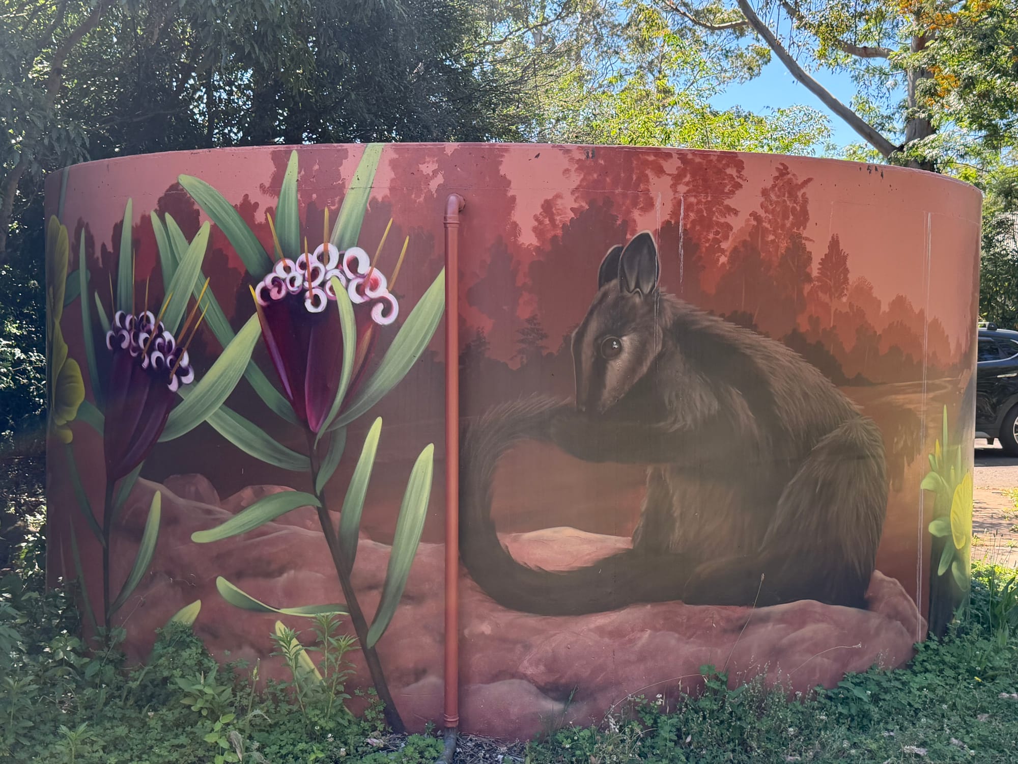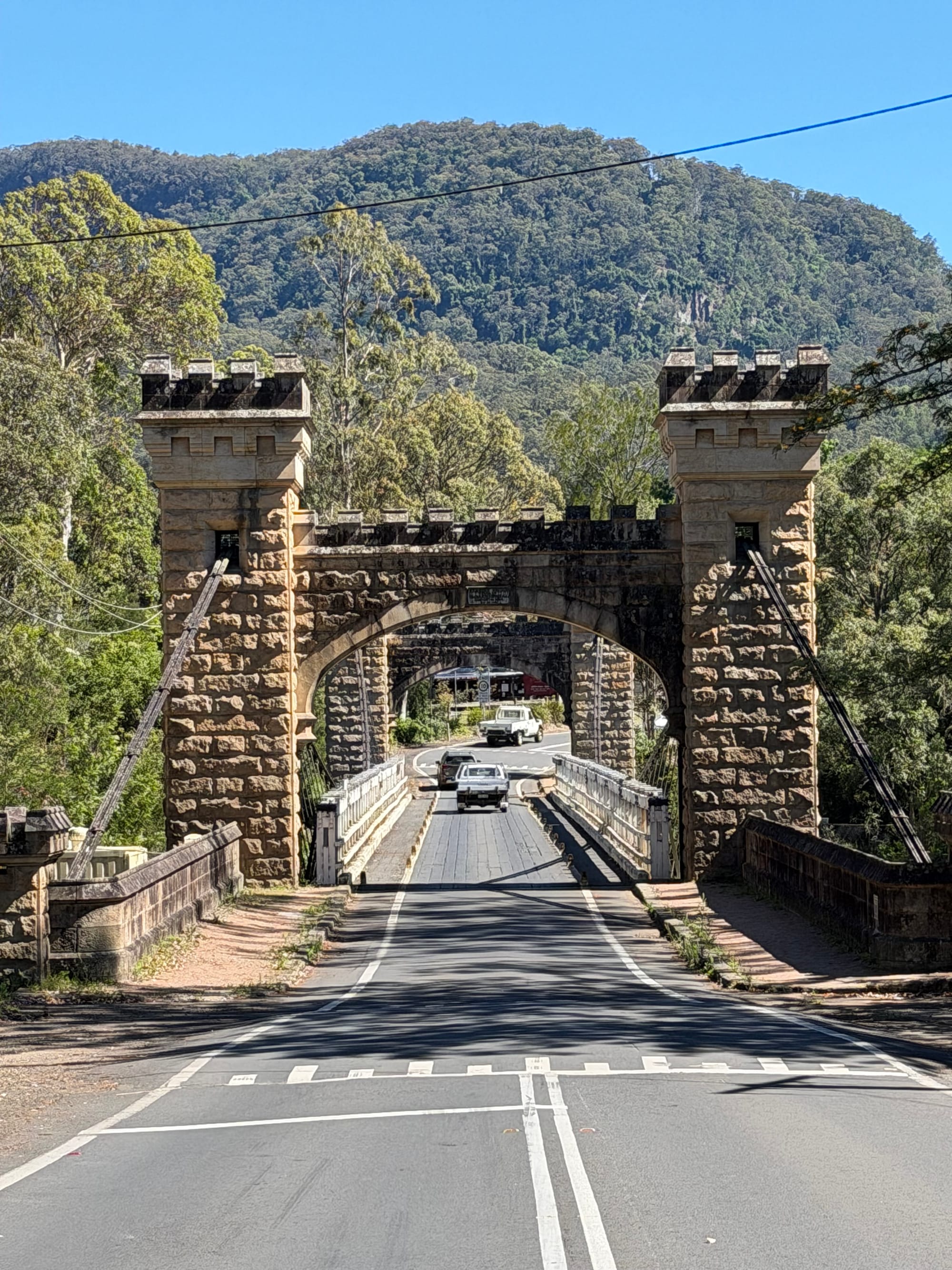 We left Gerroa around 09:30, headed south along the coast. Once again, we planned a few outings and a lunch stop with the help of ChatGPT. So far, this tool has been a great help. There are so many things to see and do that we have to slim it down to the time we have. Our route took us through Berry, a nice small town with an amazing main street. More coffee shops than you could count. While we didn’t stop, we took a slow drive through the town. From there the road took us through Kangaroo Valley where we took a short detour into the town of Kangaroo Valley to find a painted water tank. There are silos and water tanks around Australia that artists have painted with local wildlife, flowers, etc. Our friend Marilyn has an app that shows where they are in the local area. As luck would have it, we also came across the Hampton Bridge at the edge of town. Opened in 1898, it’s Australia’s last wooden suspension bridge. Its gothic towers make it that much more unique. We took another quick detour to a lookout at Cambewarra and an incredible view out over valley to the ocean.