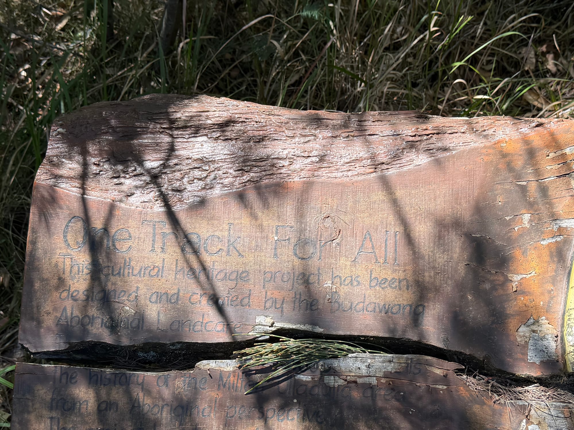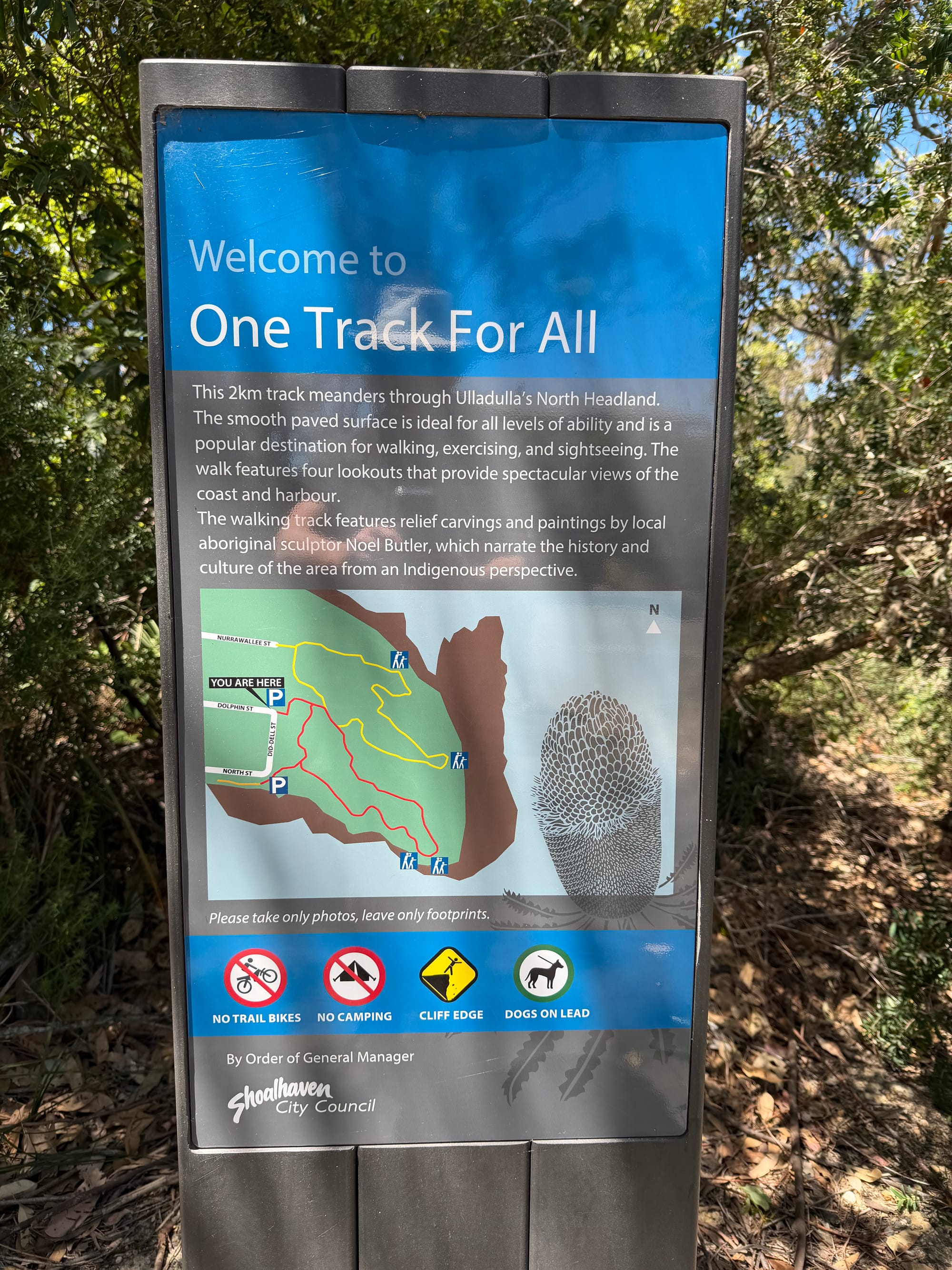 We continued on our winding way down the valley to Ulladulla, where we planned a short walk labelled One Track for All. It’s a cultural walk of about 2 km with lots of carved boards highlighting the dual culture nature of Australia. Looking out from the 4 viewpoints along the way, the water was a beautiful blue and not a cloud in the sky.