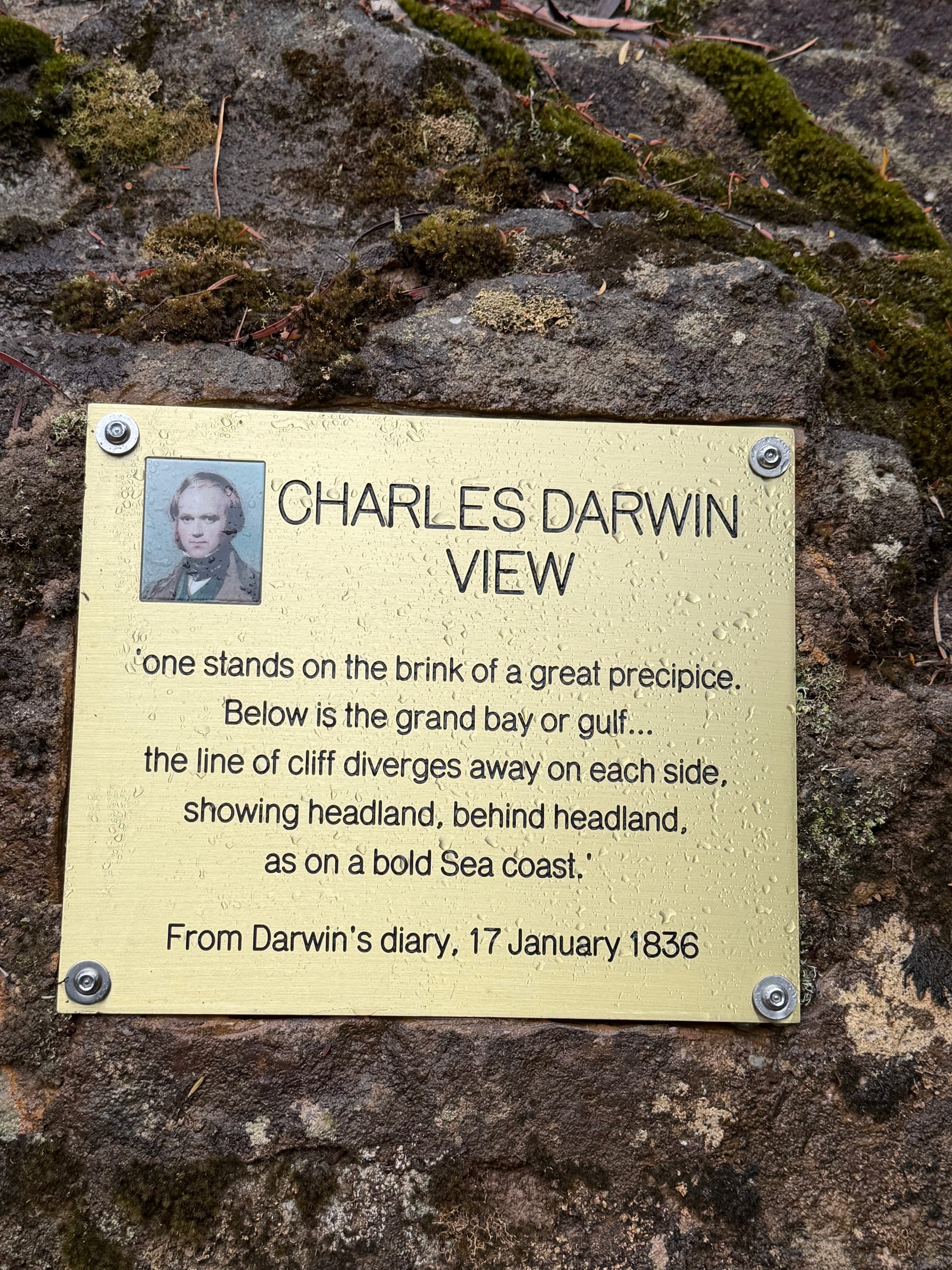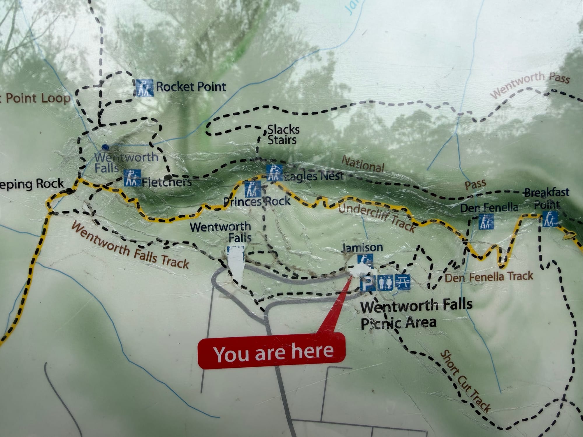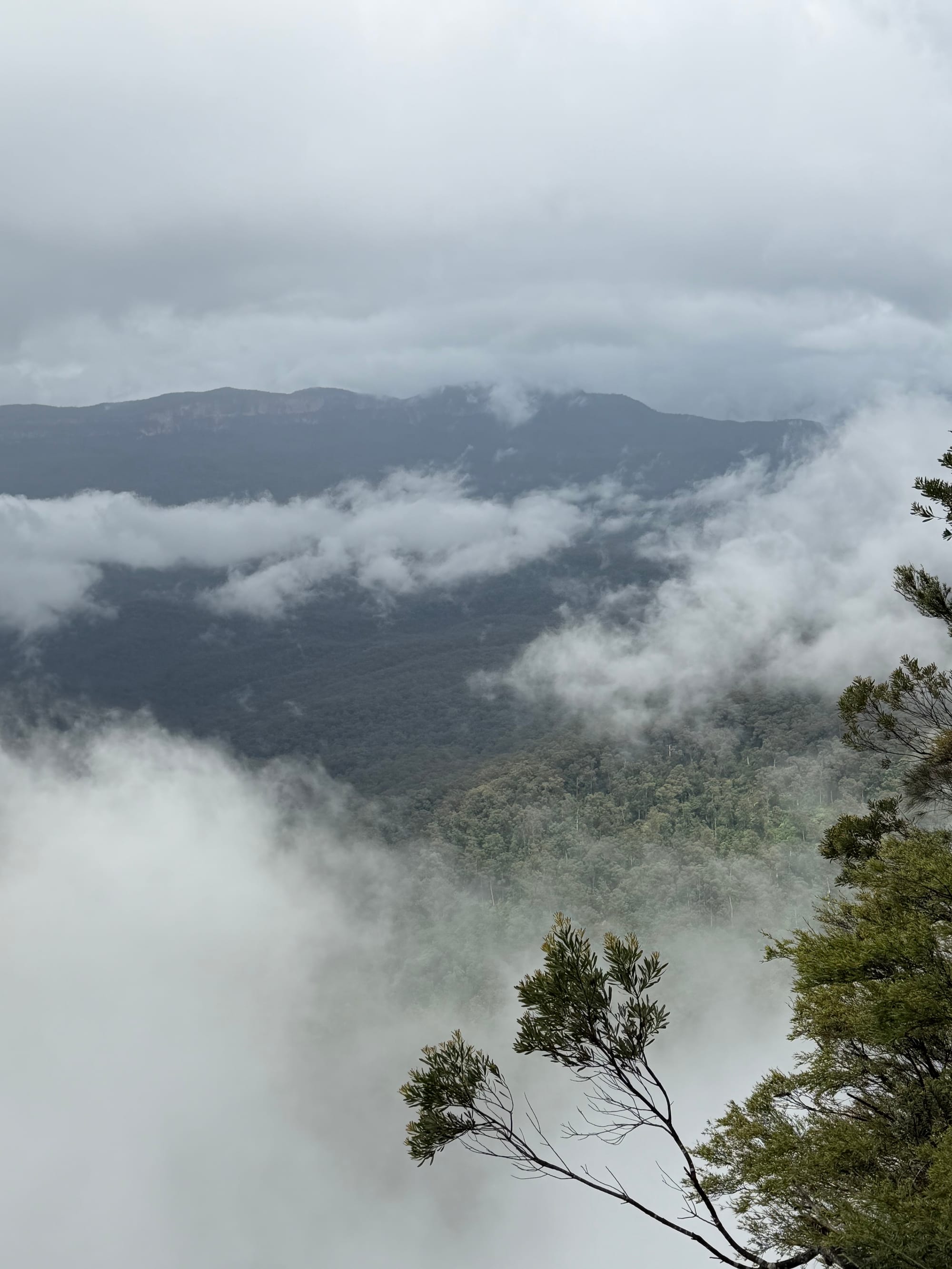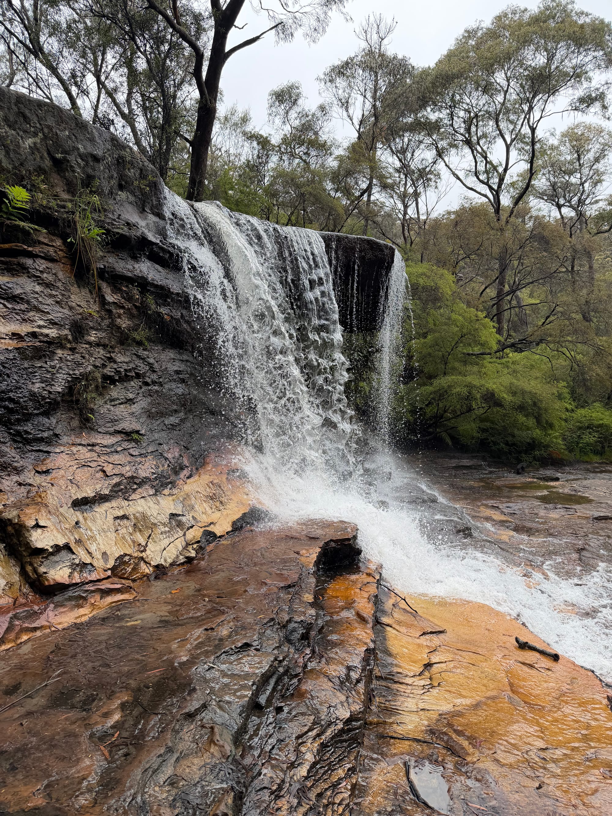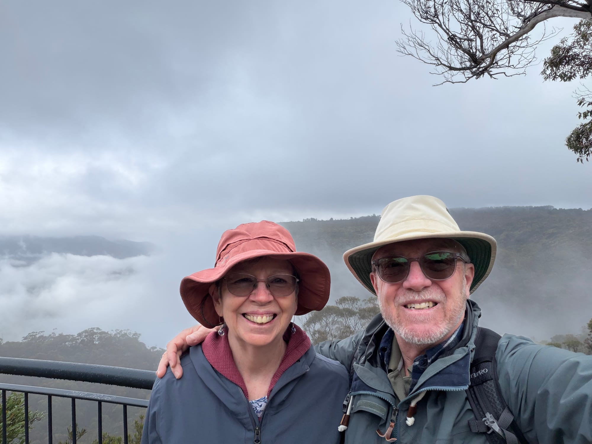 Had a nice breakfast at the hotel then Marilyn came and picked us up to head off to hike in the mist. We went to Wentworth Falls in the Blue Mountains National Park and set out to see what we would through the clouds and mist. We headed down the trail towards Wentworth Falls, passing by the point that Charles Darwin visited in 1836. The scenery was beautiful and there are lots of smaller falls along the track. We got the top of the Wentworth falls, continued across and down the other side a bit to try and get a better view. The clouds were filling the valley so not much visibilily. You just had to wait and see if there was a going to be a break. We talked to this young couple who had just come from the “Undercliff Track” on the other side of the falls (from where we came). They said it was worth the walk and not too difficult so off we went. You walk a portion under cliff overhangs, hence the tracks name, and there are a few nice viewpoints along the way. Got a nice break in the clouds for some decent pics of the falls. The trails are well maintained and built for the rain!