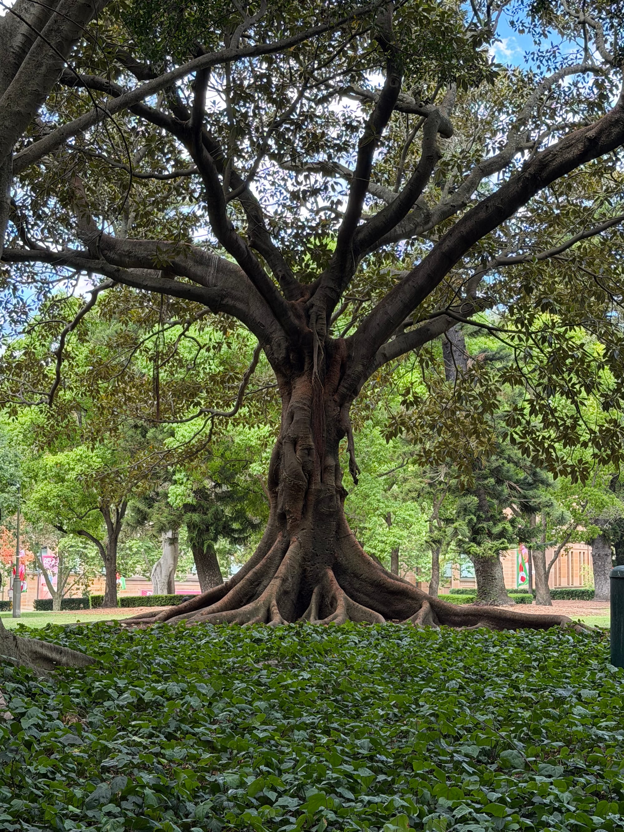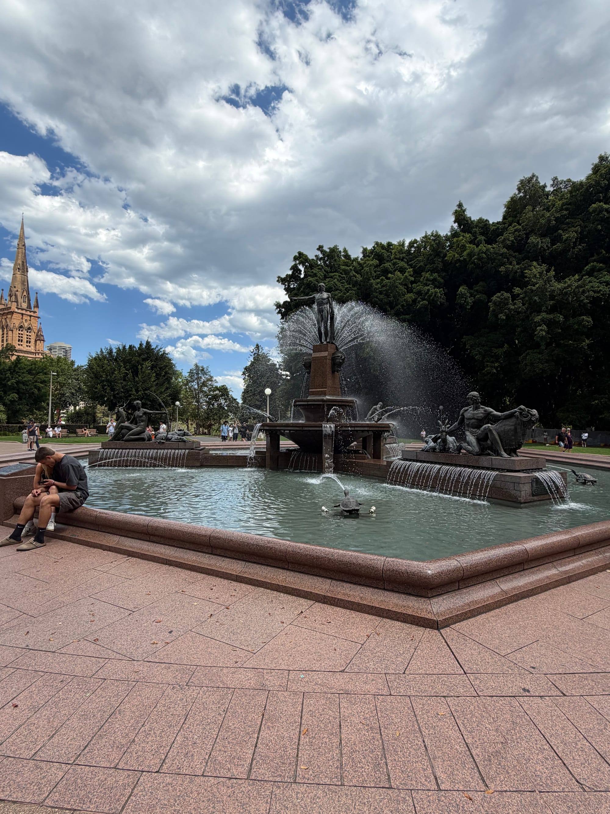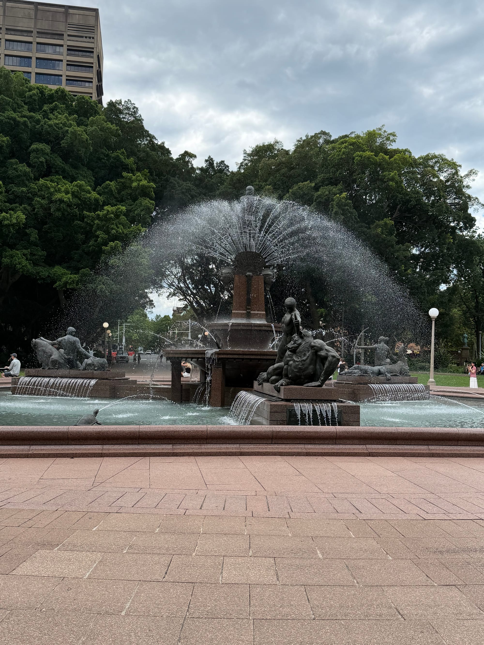 We took the train from East Gosford to Sydney, a nice 1 1/2 hour ride that brought us to the heart of Sydney. A short walk and we dropped our bags off at the hotel and went off to get some lunch and do a bit of exploring. After being in small towns for the most part the last 2 weeks, the hustle of a big city was actually a nice change. I find that to much of the same doesn’t allow you to experience the vast range of experiences available when travelling. Our hotel is in Chinatown, and the area around is busy with restaurants, kiosks, shopping, and people! Found a place for lunch, and turned once again to AI to sort out a walk for the afternoon. Ended up in Hyde Park, home of the ANZAC Memorial pictured above. We’ve seen the history of ANZAC from both the New Zealand and Australian points of view, and it’s obvious that it is one of the key ties between the two countries. The fountain in Hyde park is beautiful and worth a look.
