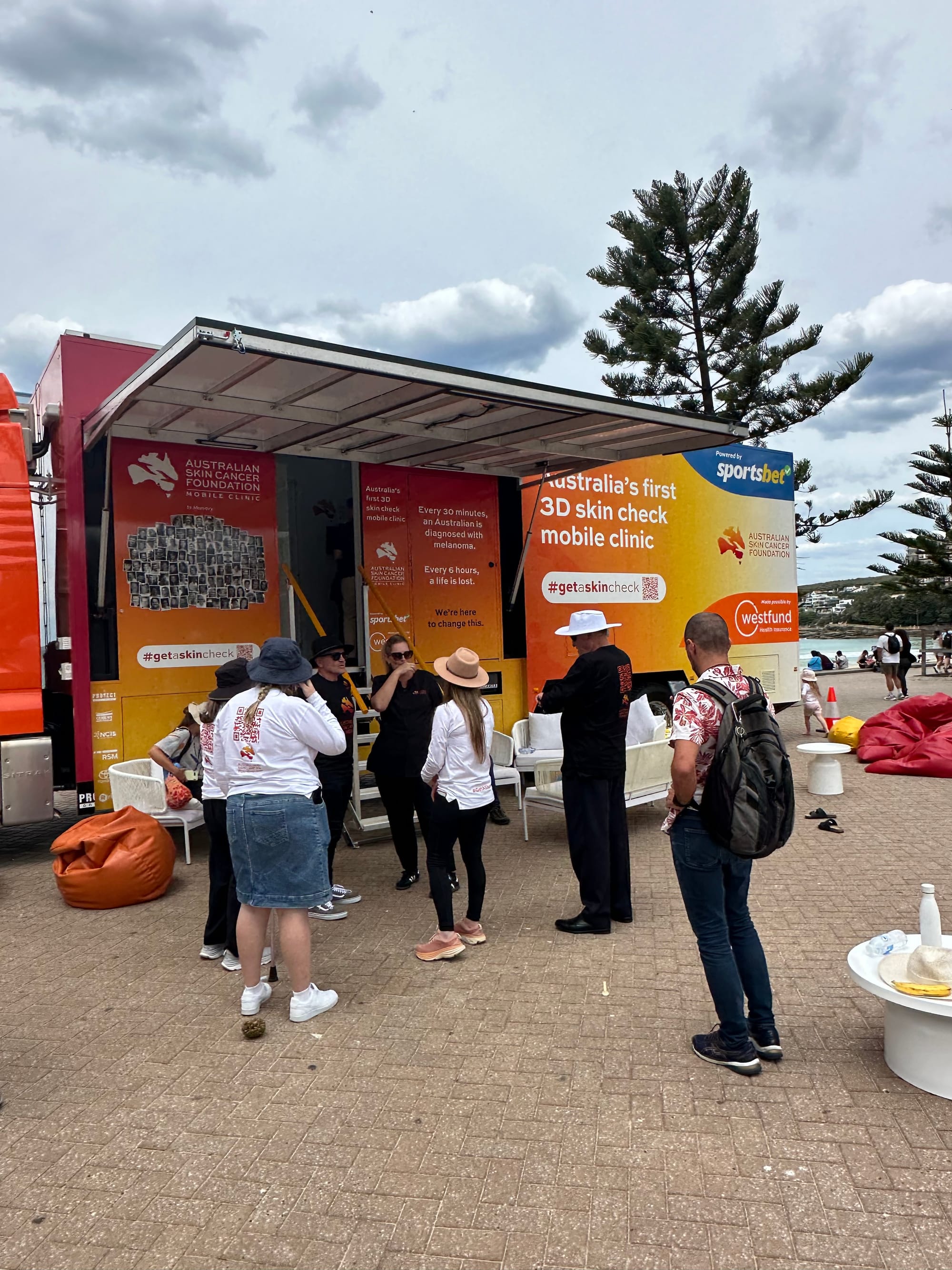 Had a nice wander around Manley, went to the Steyne Hotel for lunch, walked the boardwalk next to the beach watching the surfers (in wetsuits), volleyball, sunbathers, all the things you see on a beautiful beach. Manley is all about tourists, bars and restaurants everywhere. Lots of pedestrian only streets and traffic was pretty light. All in all a nice way to spend a few hours if you’re in Sydney. The sun here is pretty fierce and there is a high incidence of skin cancer in Australia so it was good to see a mobile skin cancer screening truck at Manley. Lots of people queueing up to be tested.